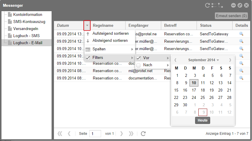 Im Logbuch können Sie Ihre Nachrichten nun nach Versandregeln, nach Datum, Versandstatus u.v.m filtern.