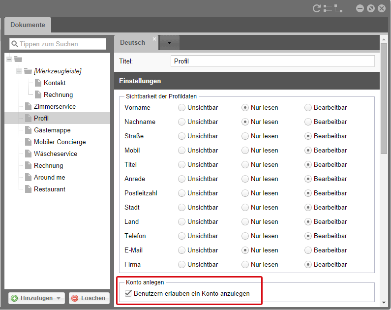 protel Cloud Center > Voyager > Inhalte > Profil > Konto anlegen