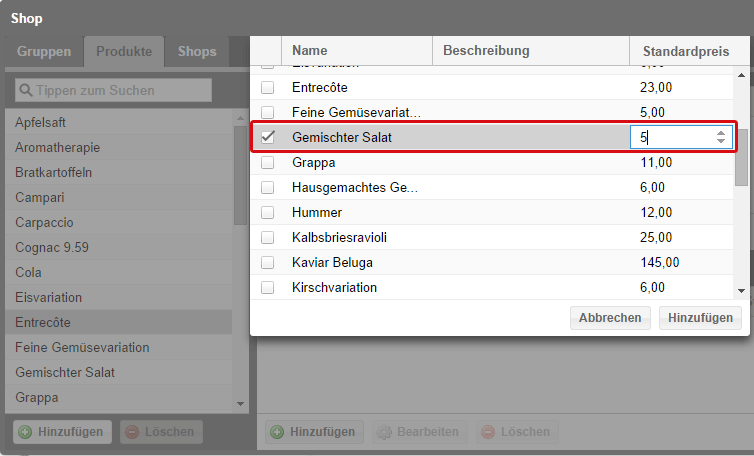 Wenn ein Zusatzartikel einem Produkt zugeordnet wird, kann direkt beim Hinzufügen ein Preis für diesem Zusatzartikel festgelegt werden.