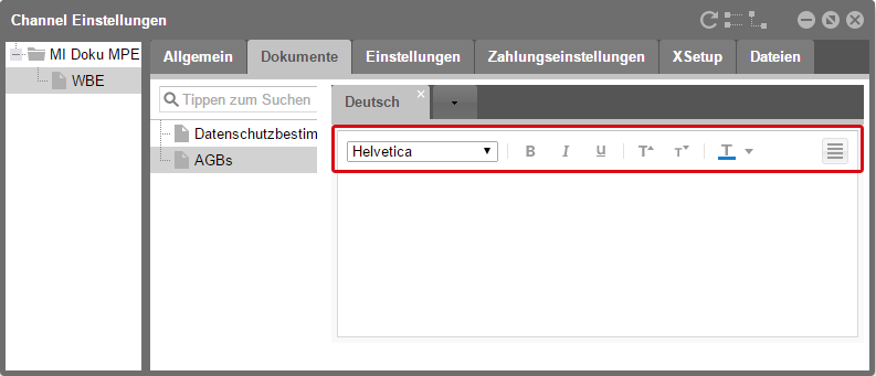 Der neuen Editor, der auch in protel Messenger verwendet wird, ist jetzt auch im Fenster "Channel Einstellungen" implementiert. Darin können Sie Ihre AGBs und Datenschutzbestimmungen für Ihre protel WBE eingeben.