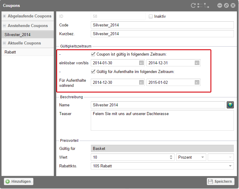 Es gibt einen neuen Dialog, um Coupons für die protel WBE zu erstellen. Im Unterschied zum alten Dialog können Sie jetzt zwischen zwei Gültigkeitszeiträumen unterscheiden.