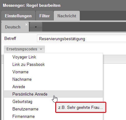 von neuen Nachrichten. In dem Auswahlmenü der Ersetzungscodes werden