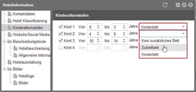 in den Hotelinformationen fest, für welche Kinderaltersstufen welches