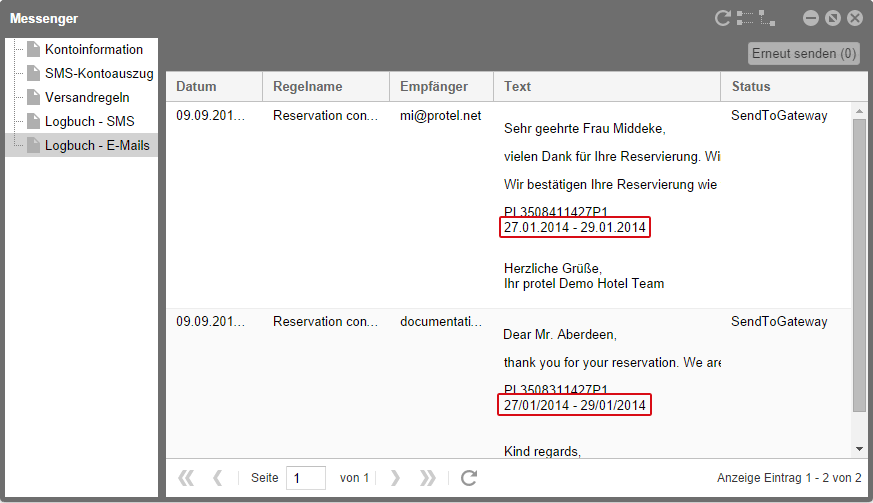 protel Cloud Center > Messenger > Logbuch - E-Mails