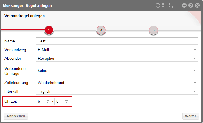 Bei wiederkehrenden Versandregeln variiert nun die vorgeschlagene Versandzeit. Sie hatten schon immer die Möglichkeit, einen individuellen Versandzeitpunkt festzulegen, der Standardwert für die Versandzeit war jedoch überall gleich. Falls Sie die Standardzeit nicht geändert haben, haben Gäste, die mehrere Filterkriterien erfüllen, zur gleichen Zeit mehrere Nachrichten bekommen. Daher schlägt protel Messenger beim Anlegen einer neuen Versandregel nun automatisch unterschiedliche Zeiten vor. Selbstverständlich können Sie diese weiterhin manuell anpassen.