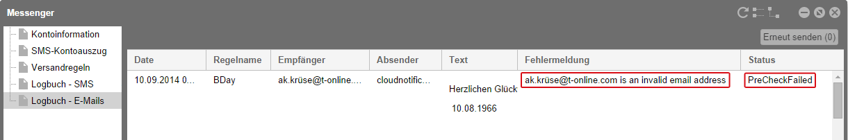 Die Fehlermeldung gibt an, welche Gastadresse ungültig ist und der Status zeigt an, dass bei dieser Adresse die Vorabprüfung nicht erfolgreich war ("PreCheckFailed"). Korrigieren Sie in solchen Fällen die E-Mail-Adresse in der protel Gästekartei und senden Sie die Nachricht danach gegebenenfalls noch einmal.