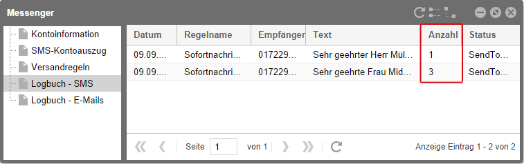 protel Cloud Center > Messenger > Logbuch - SMS > Anzahl