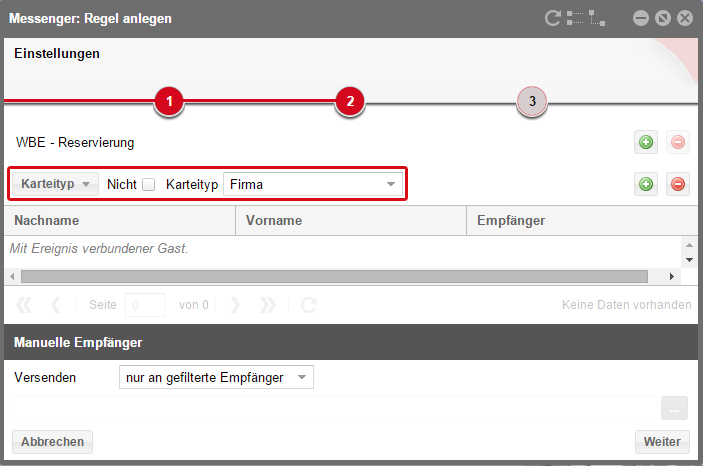 Ergänzen Sie dazu in Ihrer Messenger-Versandregel einfach den Filter [Karteityp]. Daraufhin wird das dazugehörige Auswahlmenü eingeblendet, in dem Sie den gewünschten Karteityp auswählen können.