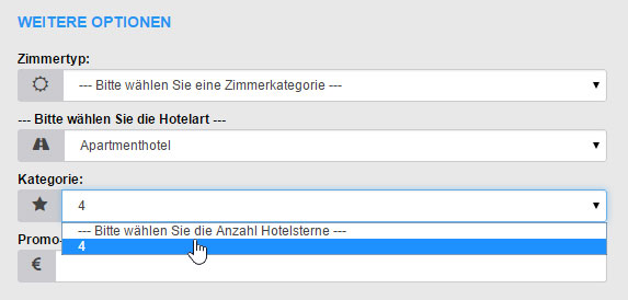 Nach diesen Parametern können Ihre Gäste in der WBE dann gezielt suchen. Das ist vor allem für Hotelgruppen sinnvoll, die Ihre Auswahl an unterschiedlichen Hotels auch in den Filtern darstellen wollen.