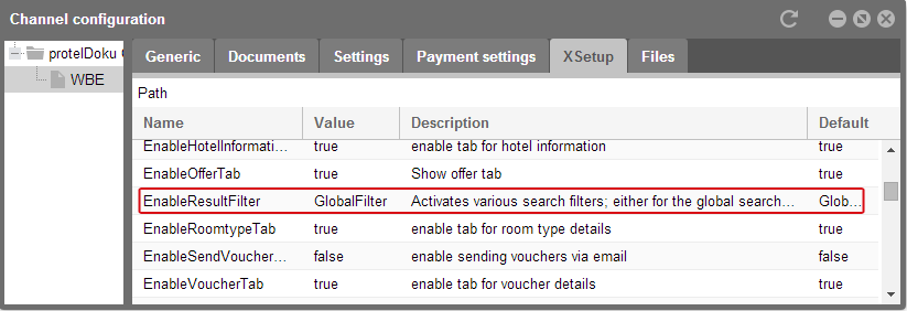 Click on the “WBE” located on the left in the navigation and open the “XSetup” tab. Search for the “EnableResultFilter” entry in the list and select “GlobalFIlter, “OnlyRoomtab” or “None”.