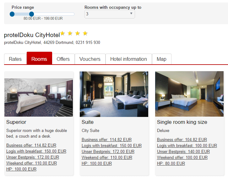 The guest has access to a practical, easy-to-use search function. In addition to the rate filter, he can also find a selection menu for occupancy. If in the occupancy drop-down "3" is selected, the search will display rooms which can be used up to four guests only.