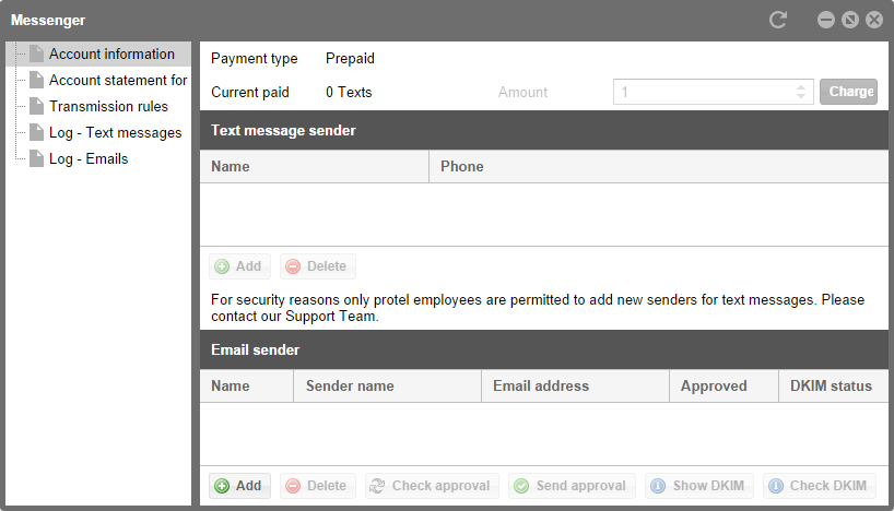 The window first only shows the account information. The account information will give you information about your current short messages balance and the sender number for your messages. If you would like to send short messages, purchase a corresponding short messages balance from protel. Using the email service does not require any purchasing.