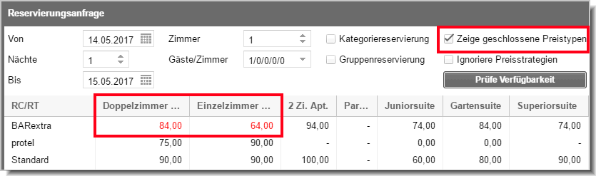 Die Option "Zeige geschlossene Preistypen" ermöglicht Ihnen, in der Reservierungsanfrage auf Preise zuzugreifen, die durch eine Preisstrategie geschlossen wurden.